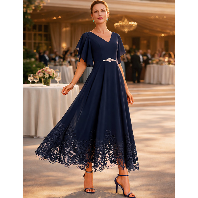 A-Line Tea Length Party Dress Cocktail Dress Wedding Guest Dress Mother of the Bride Dress Short Sleeve V Neck Elegant Formal Wedding Guest Chiffon Lace with Appliques Crystal Brooch