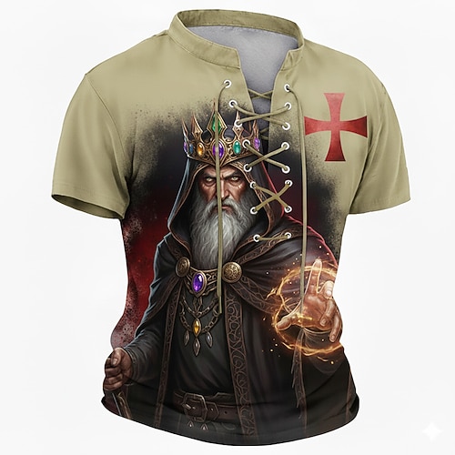 Herren Kreuzritter Mittelalter König Zauberer Goldene Krone Magische Energie Roter Tempelritter Kreuz Fantasy Gothic Retro Krieger Schnür-T-Shirt Allover-Druck Henley V-Ausschnitt Kurzarm Streetwear