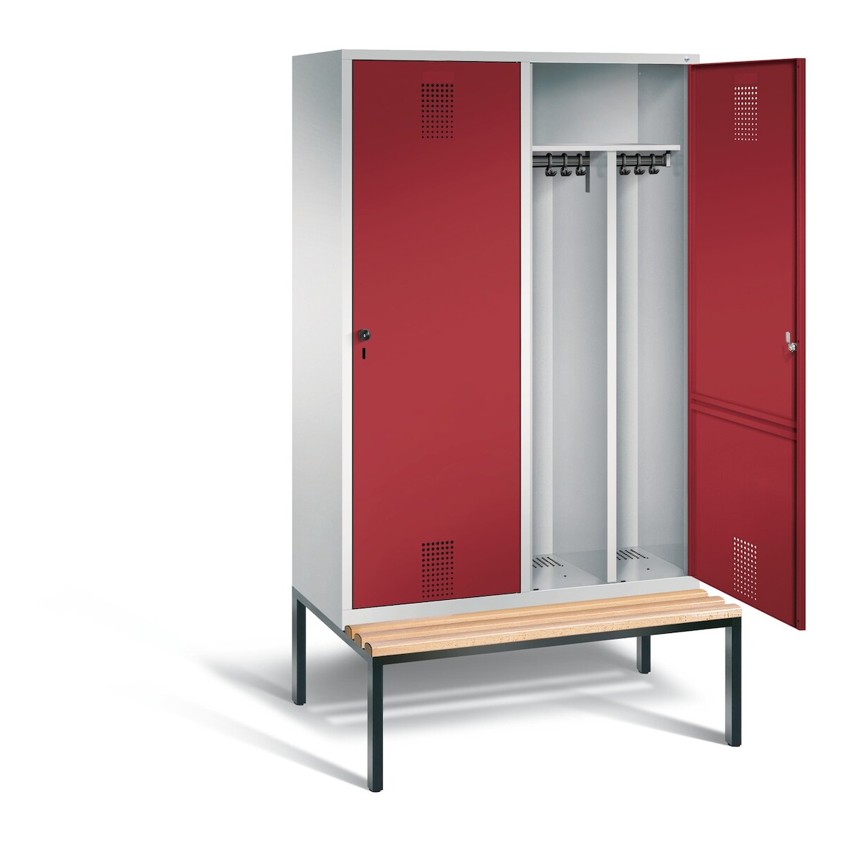 C+P Spind Classic PLUS, Buche schwebende Sitzbank, 4 Abteile, HxBxT 212x60x82cm, Zylinderschloss, Hellgrau/Rubinrot von PROREGAL