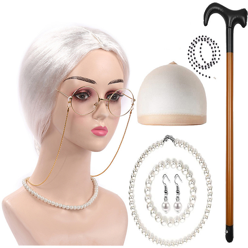 Old Lady Wig with Hair Rollers Pearl Necklace Earrings Cane Set for Women Girls Grandma Cosplay 100 Days of School Costume Halloween Party Accessorie