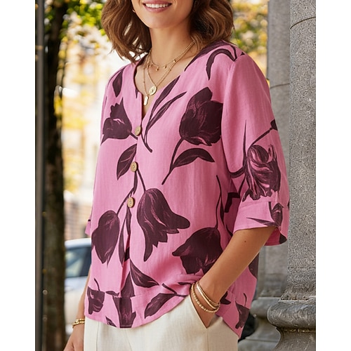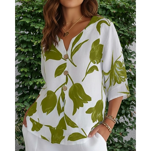 Per donna Blusa Finto cotone e lino Floreale Vintage Elegante Casual Manica 3/4 Scollo a V Top Regolari Quotidiano Ferie Uscire Bottoni Stampato Bianco Vino Rosso Verde Viola Estate Primavera