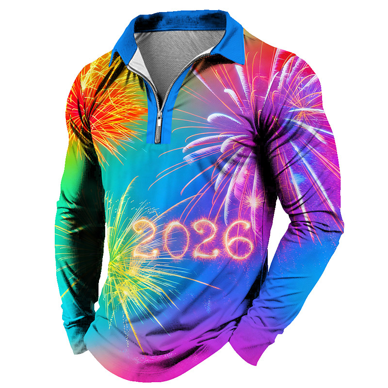 New Year Men's Fireworks Polo Long Sleeve Polo Shirts Lapel Casual Daily Wear Festival Outfit 3D Print Quarter Zip Polo Spring Fall Winter Blue Purple Green