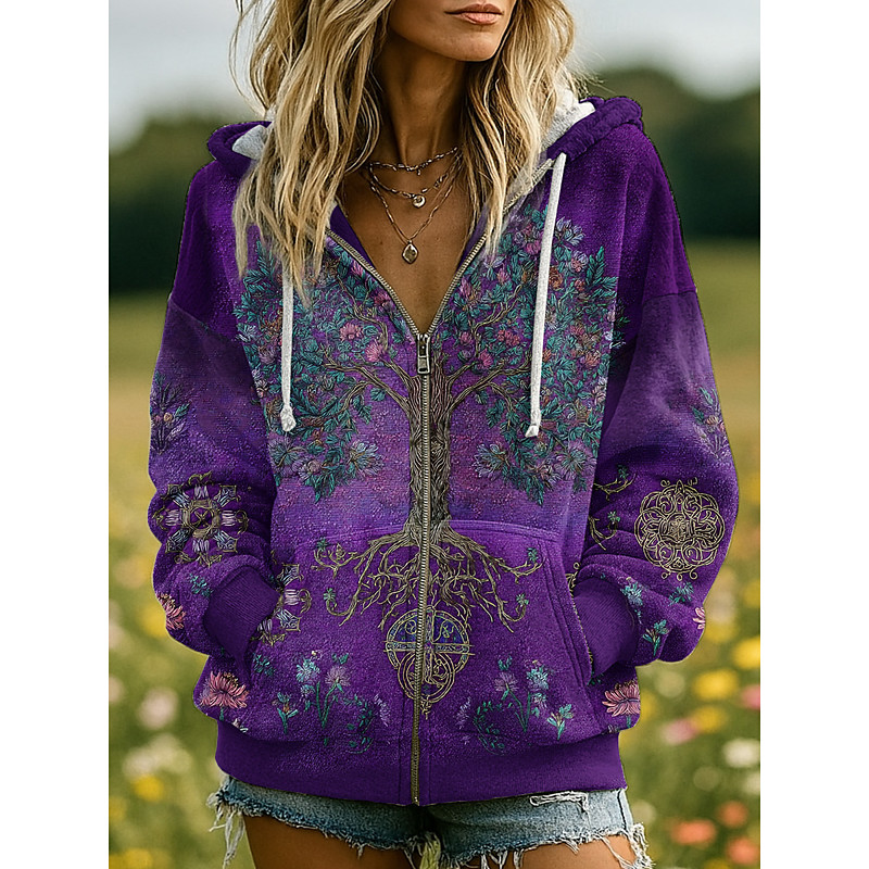 Women's Zip Up Hoodies Floral Graphic Fashion Casual Long Sleeve Hooded Regular Tops Street Dailywear Patchwork Zipper Pocket Purple Spring Fall