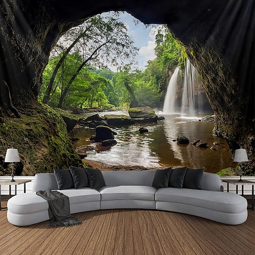 Cascata nella foresta pluviale tropicale, paesaggio 3D, arazzi da parete, rocce verdi ricoperte di muschio e ruscello nella giungla, arazzo naturale da appendere per soggiorno, camera da letto, bagno,