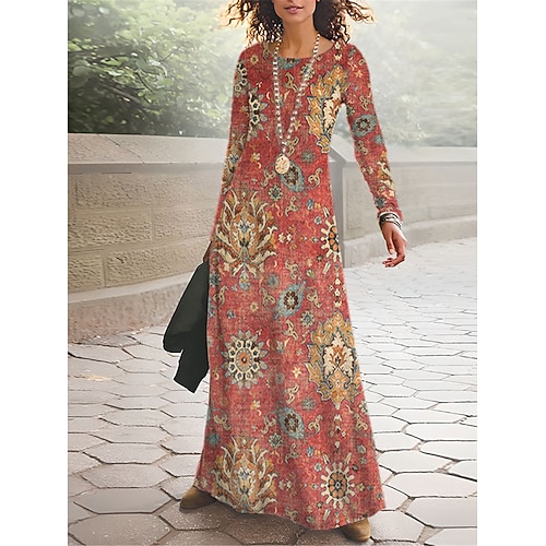 Damen Langes Kleid Maxikleid Freizeitkleid Winterkleid Druckkleid Vintage Ethnisch Tribal Outdoor Straße Täglich Normale Passform Blumen Stammes Langarm Rundhalsausschnitt Schwarz Rote Königliches