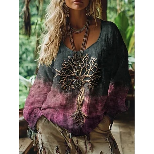 Damenbluse Grafik Vintage Alltag Casual Langarm V-Ausschnitt Normal Oberteile Tribal Lebensbaum Vintage Designer Basic Print Urlaub Straße Ausgehen Alltag Feiertagsdruck Lila Sommer Frühling Herbst