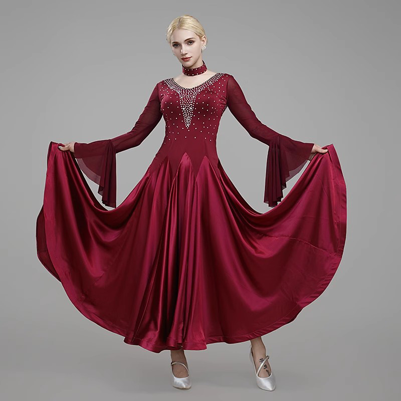 Sheer Sleeve Ballroom Dance Dress for Women - Long Sleeve A-Line Gown for Competitions, Latin, and Dance Events - Black