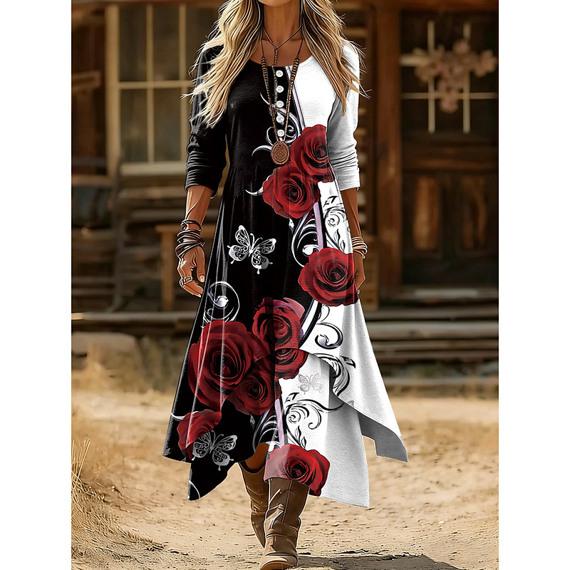 Women's Midi Dress A Line Dress Casual Outdoor Going out Standard Fit Floral Graphic 3/4 Length Sleeve V Neck Black White Red Spring Fall