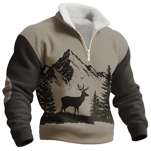 Herren Hirsch Fleece Pullover Mode Lässig 3D Jagd Stehkragen Viertelreißverschluss Outdoor Streetwear Urlaub Geschenk Braun Khaki Dunkelgray Grau Halber Reißverschluss Herbst Winter Designer S M L XL