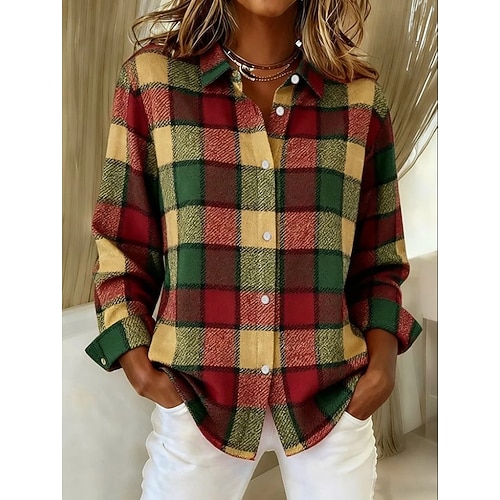 Per donna Camicia Blusa Plaid Casual Manica Lunga Colletto a Camicia Top Regolari Quotidiano Patchwork Bottoni Stampato Blu Nero Rosa Rosso Blu turchese Autunno Inverno