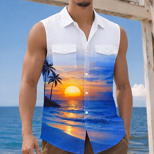 Per uomo Albero di Cocco Natura e paesaggi Tramonto Camicia Camicia hawaiana estiva Camicia Aloha Senza Maniche Resort Vacanza al Mare Estate Primavera Collo ripiegato Stampa 3D Due tasche anteriori