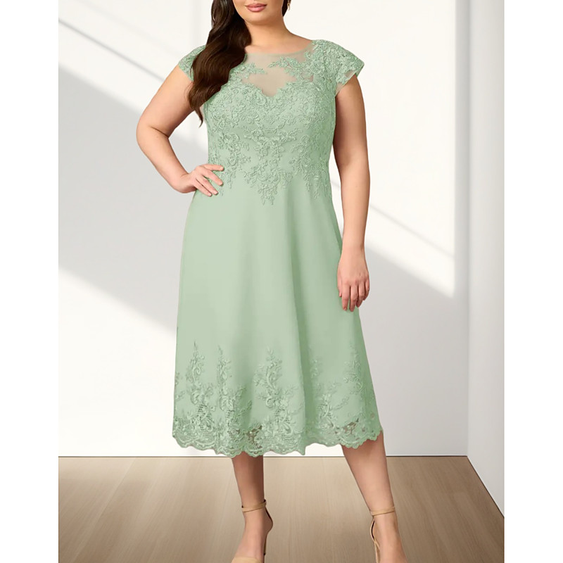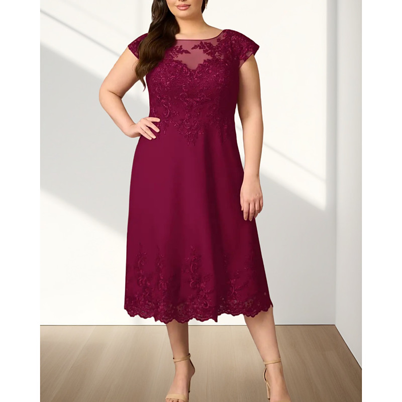 A-Line Tea Length Party Dress Cocktail Dress Wedding Guest Dress Mother of the Bride Dress Short Sleeve Jewel Neck Elegant Formal Wedding Party Chiffon with Lace