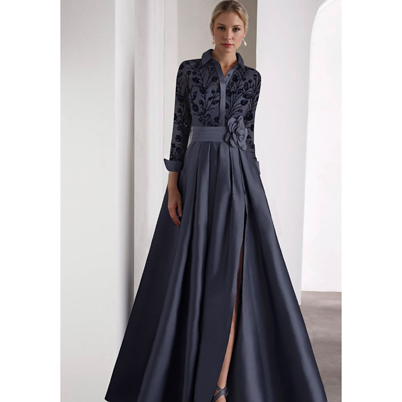 A-Line Floor Length Wedding Guest Dress Formal Dresses Evening Gown Mother of the Bride Dress 3/4 Length Sleeve Shirt Collar Elegant High Split Formal Satin with Buttons