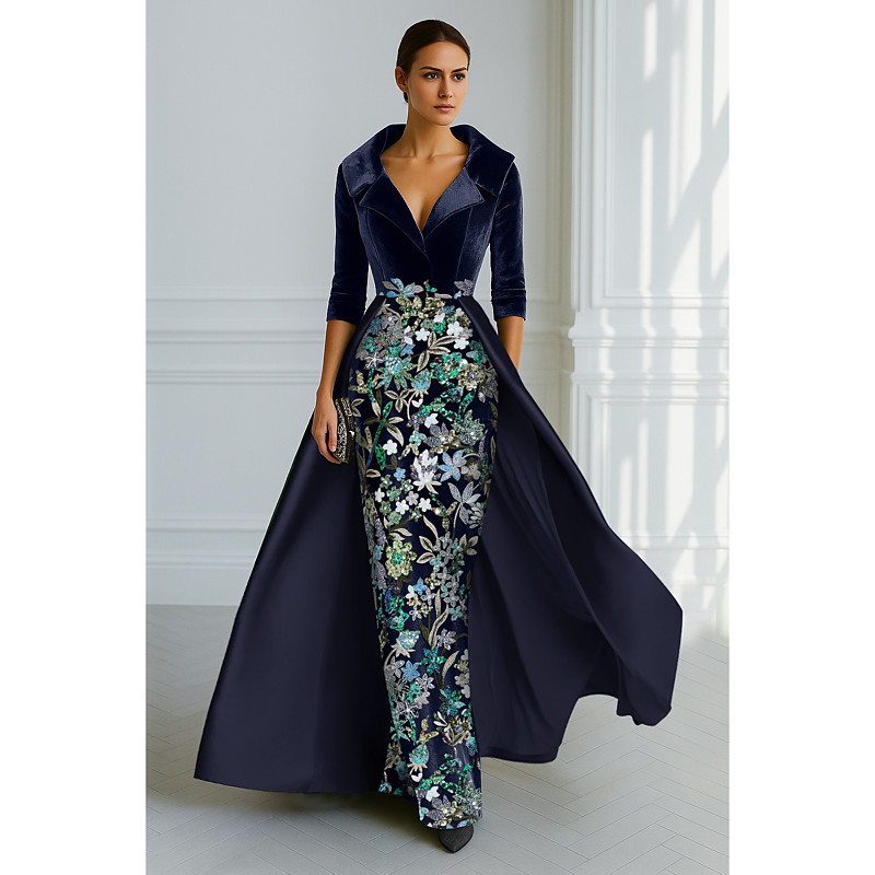 A-Line Floor Length Beaded Eembroidered Formal Dresses Mother of the Bride Dress Evening Gown Ball Gown with Overskirt Formal Dress Elegant Color Block High Split Half Sleeve Shirt Collar Wedding