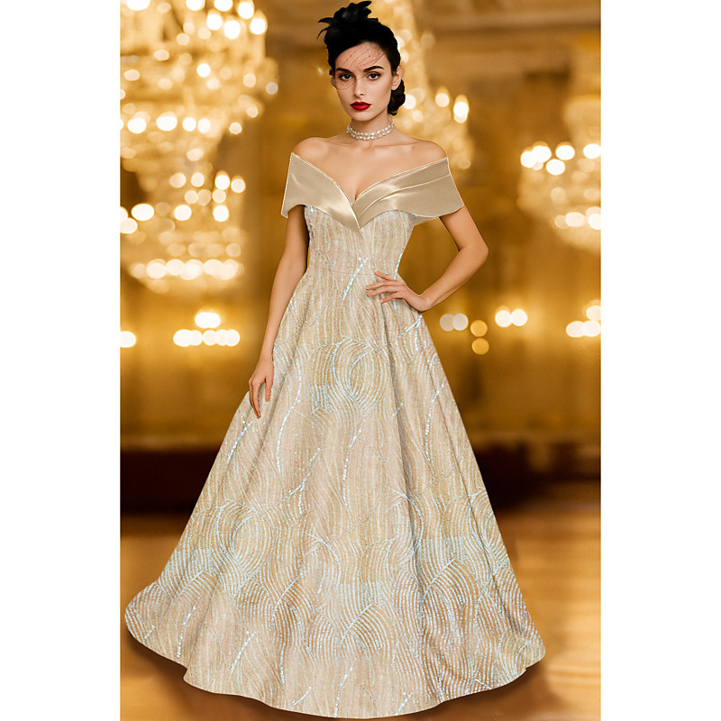 A-Line Floor Length Beaded Eembroidered Formal Dresses Mother of the Bride Dress Evening Gown Ball Gown Formal Dress Elegant Color Block High Split Short Sleeve Off Shoulder Wedding Formal Satin