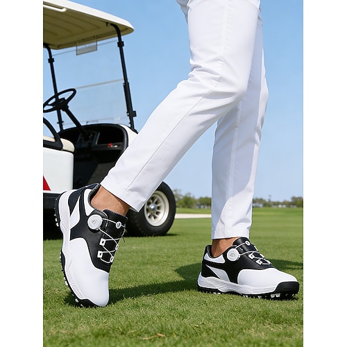 scarpe da golf da uomo bianche e nere, suola antiscivolo resistente, tomaia traspirante, stile sportivo classico per campi da golf e abbigliamento casual