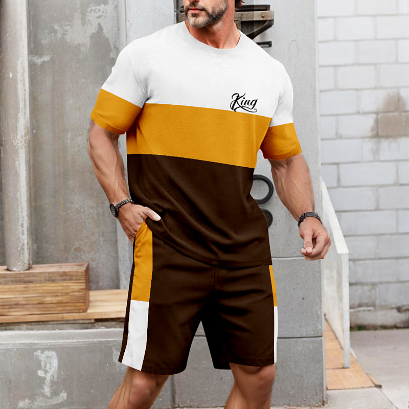 Men's Horizontal Stripes 2pcs Tees sets Summer Tops Short Sleeve Short Pants Crew Neck Sport Casual Outdoor Vacation Sport 3D Print Summer Pink Brown Green
