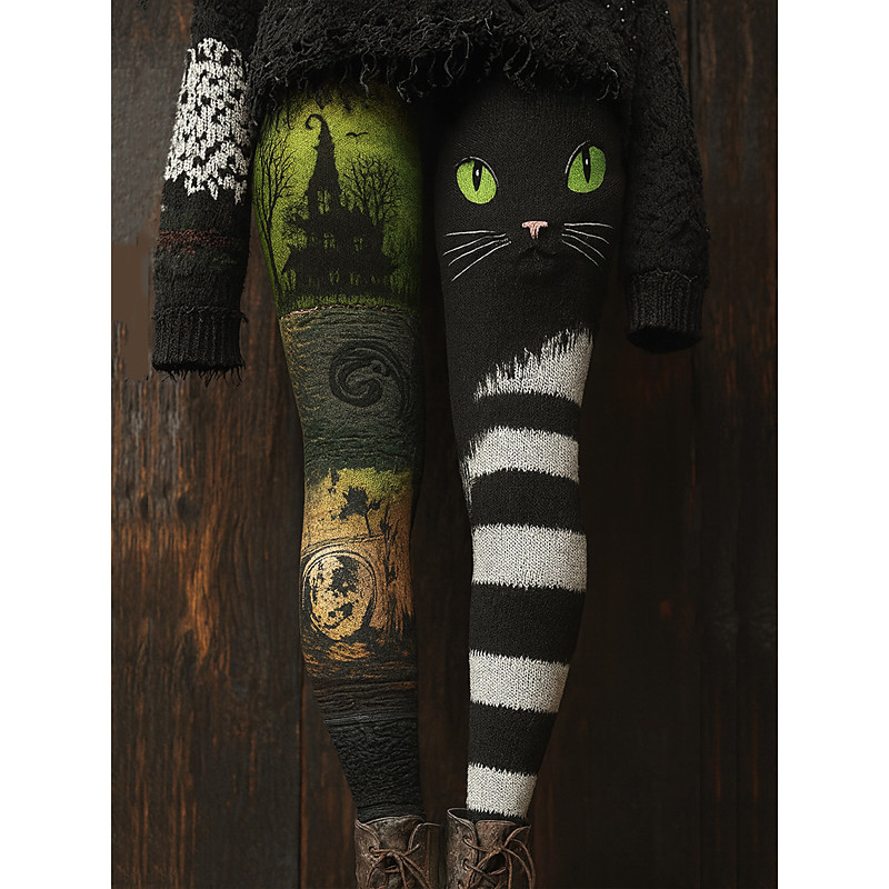 Women's Leggings Vacation Vintage Ethnic Style Full Length High WaistPantsHalloween Graphic Animal Cat 3D Print Asymmetric Quick Dry Breathability Soft Stretchy Formal Outdoor Vacation Purple Green