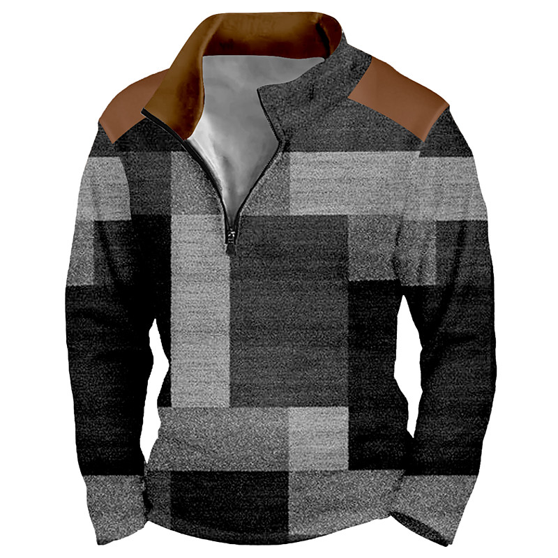 Men's Geometric Plaid Waffle Sweatshirt Fashion Daily Classic Casual Stand Collar Quarter Zip Outdoor Home Office Work Blue Brown Green Gray Zip Up Fall Winter Designer S M L XL XXL XXXL