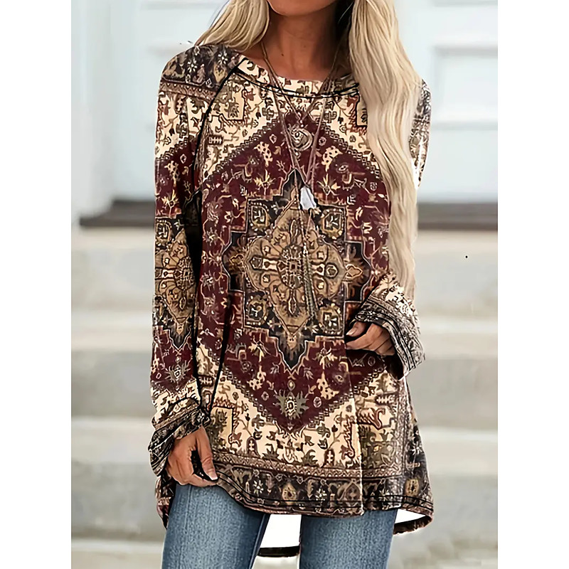 Women's T Shirt Graphic Tribal Vintage Stylish Classic Long Sleeve Crew Neck Round Neck Long Tops Daily Print Red Blue Khaki Spring Fall