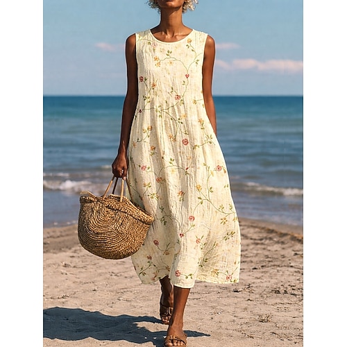 Per donna Abito Midi Vestito Estivo Abito a Tubino Abito a trapezio Vacanza Casual Boho Spiaggia Feste Uscire Vestibilità comoda Floreale Grafico Senza Maniche Girocollo Giallo Chiaro Verde scuro