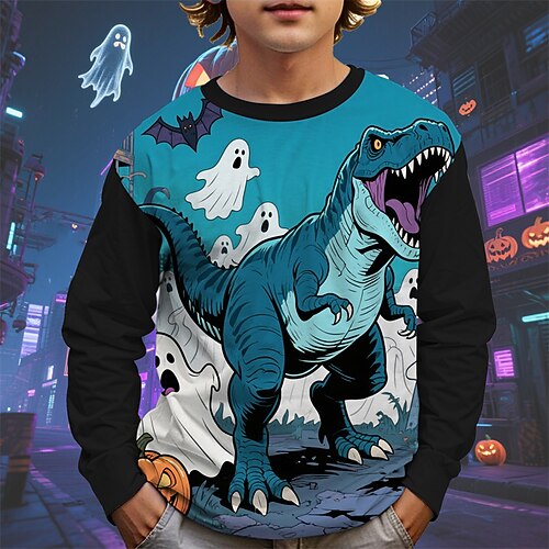 Halloween Jungen 3D Cartoon Kürbis Dinosaurier T-Shirt Langarm Frühling Herbst Mode Basic Kinder 4-12 Jahre Rundhalsausschnitt Outdoor Lässig Täglich Normale Passform