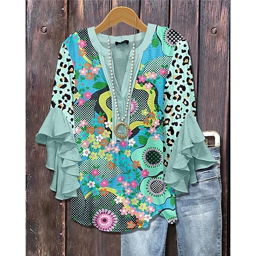 Per donna Maglietta Floreale Moda Moderno Manica 3/4 Scollo a V Top Regolari Quotidiano Volant Stampato Verde Estate