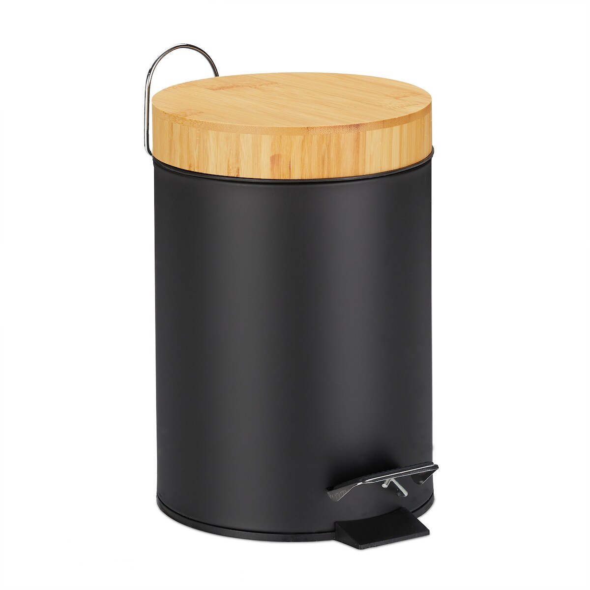 Relaxdays Mülleimer Bad, 3 l, Kosmetikeimer Absenkautomatik, Bambusdeckel, entnehmbarer Inneneimer, Treteimer, schwarz