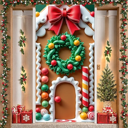 Copriporta natalizio in stile animato, decorazione natalizia con ghirlanda natalizia a forma di casetta di pan di zenzero e fiocco dorato stampato per ingresso, soggiorno, camera da letto, interni ed