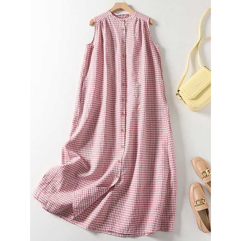 Women's Maxi Dress Cotton Linen Dresses Casual Dress Tank Dress Cotton Maxi Dress Basic Casual Vacation Daily Regular Fit Plaid Sleeveless V Neck Red Summer