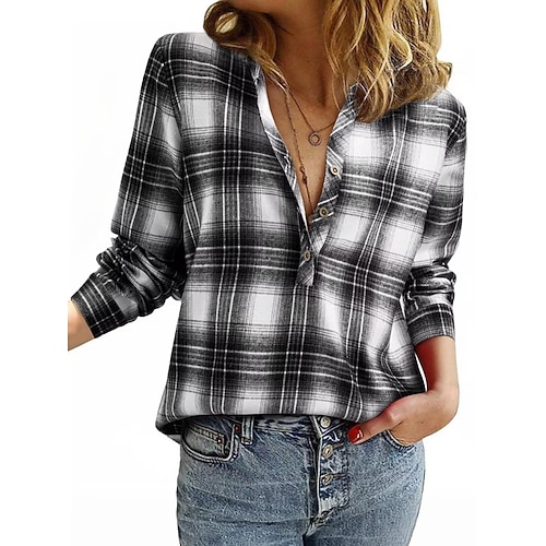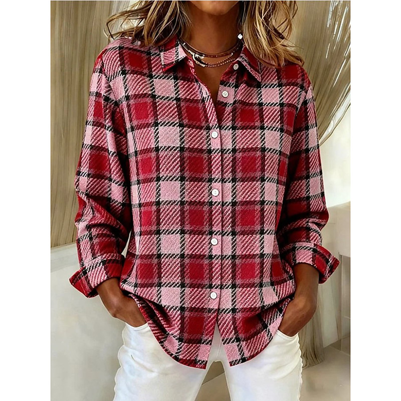 Women's Shirt Blouse Plaid Modern Casual Long Sleeve Shirt Collar Regular Tops Holiday Going out Buttons Print Black White Pink Light Brown Brown Fall