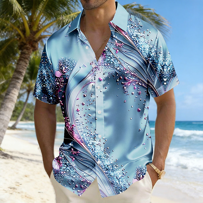 Men's Geometric Waves Abstract Art Shirt Summer Shirt Button Up Shirt Short Sleeve Fashion Casual Vacation Holiday Streetwear Summer Turndown 3D Print Front One Pocket Linen Like Shirt Blue Purple
