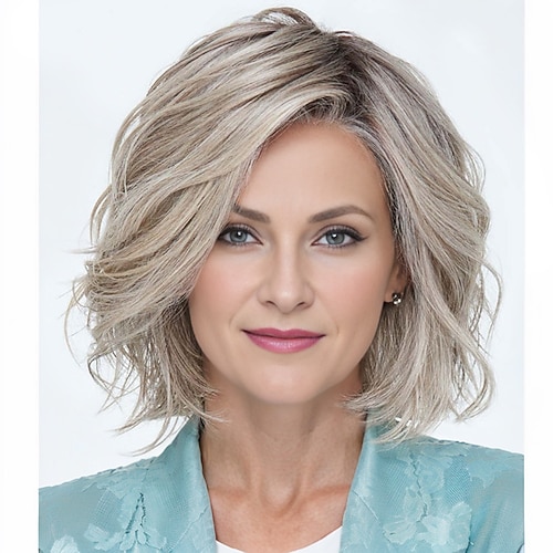 parrucca da donna, bionda cenere con mèches argentate, corta e ondulata, capelli sintetici realistici, resistenti al calore, riga laterale, elegante, stile alla moda per tutti i giorni
