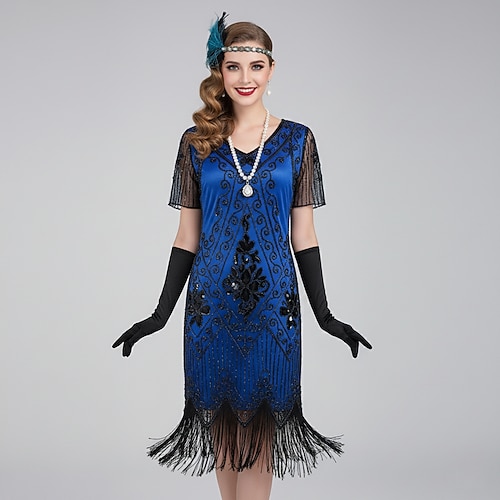 Set Anni Ruggenti Anni 1920 Abito da cocktail Lunghezza al ginocchio Abito Flapper Vestito Abiti con accessori Maniche corte Il grande Gatsby Charleston Paillettes Frangia con nappe Piuma Scollo a V
