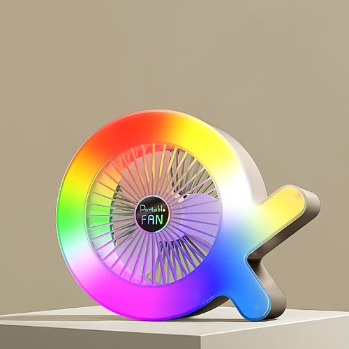 Q-förmiger Tischventilator mit farbiger RGB-LED-Beleuchtung, 3 Geschwindigkeitsstufen, leiser, tragbarer, per USB aufladbarer Mini-Ventilator für Büro, Schlafzimmer, Studentenwohnheim, Nachttisch –
