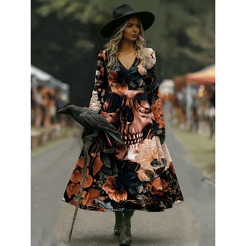 Women's Witch Print Midi Dress A Line Dress Vacation Casual Daily Regular Fit Floral Graphic Hocus Pocus Long Sleeve V Neck Black Red Brown Spring Fall