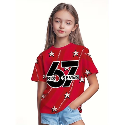 Mädchen 3D Grafik Lustiger Slang 67 T-Shirt Kurzarm 3D-Druck Sommer Frühling Sport Mode Streetwear Kinder 4-12 Jahre Rundhalsausschnitt Outdoor Lässig Täglich Normale Passform