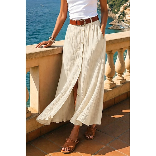 Set da donna in cotone e lino, due pezzi, nero, bianco, blu, tinta unita, con bottoni, 2 pezzi, moda quotidiana, colletto a camicia, vestibilità regolare, taglia S