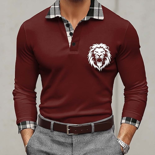 Herren Löwe Polo Langarm Polo-Shirts Revers Lässig Outdoor Straße Athleisure Alltagskleidung 3D-Druck Knöpfe Frühling Herbst Blau Schwarz Rote