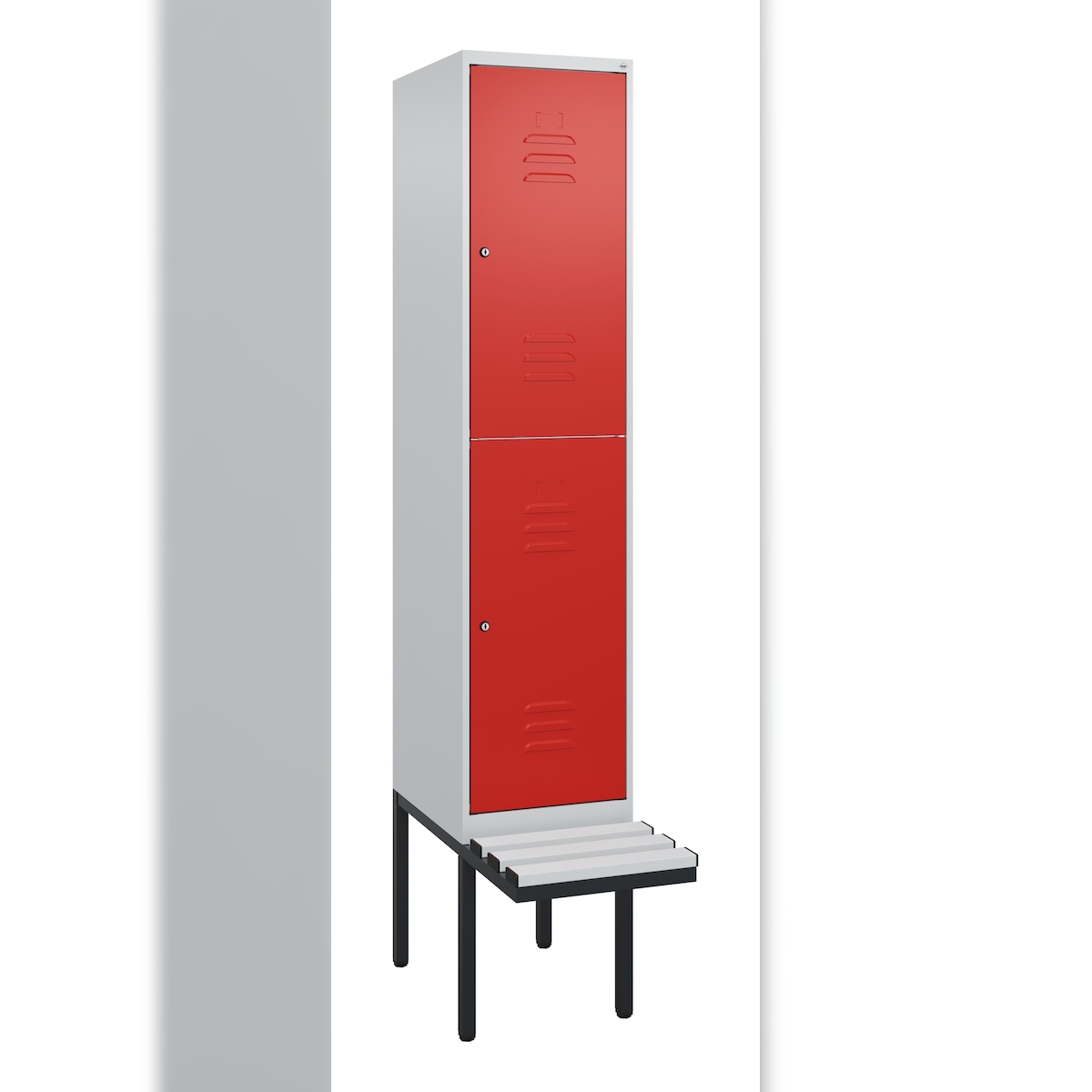 C+P Spind Classic PLUS, Kunststoff schwebende Sitzbank, 2 Abteile, HxBxT 212x40x82cm, Zylinderschloss, Hellgrau/Rot von PROREGAL