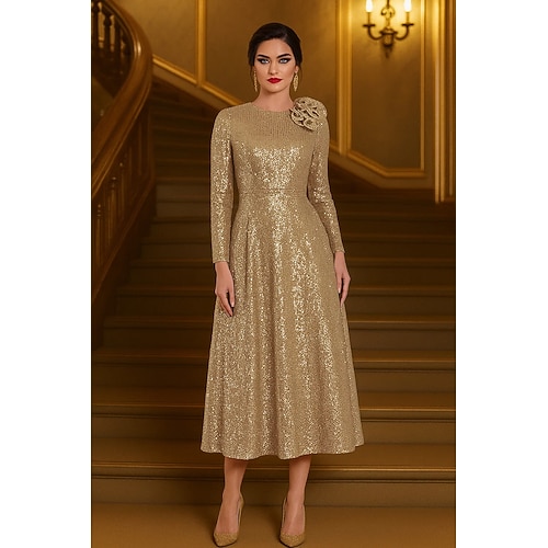 Linea ad A Lunghezza Tè Abiti da Cocktail Abiti da festa Elegante Manica Lunga Girocollo Festa in giardino Matrimonio Con Paillettes con Fiore sulla Spalla