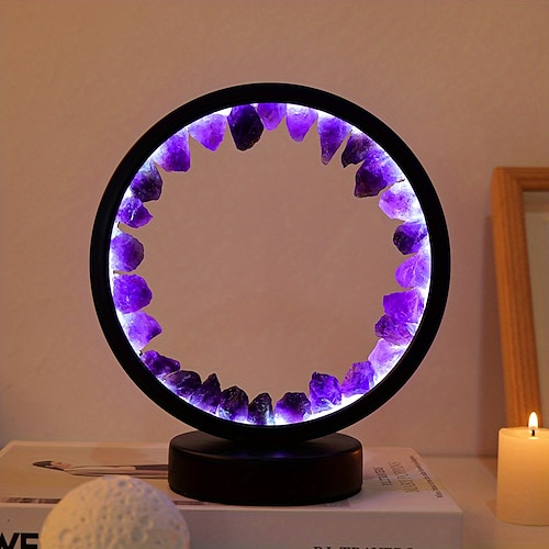 Lampada da comodino ricaricabile a led, lampada da notte con cluster di quarzo ametista naturale, lampada da scrivania per camera da letto, luci decorative circolari a cerchio.