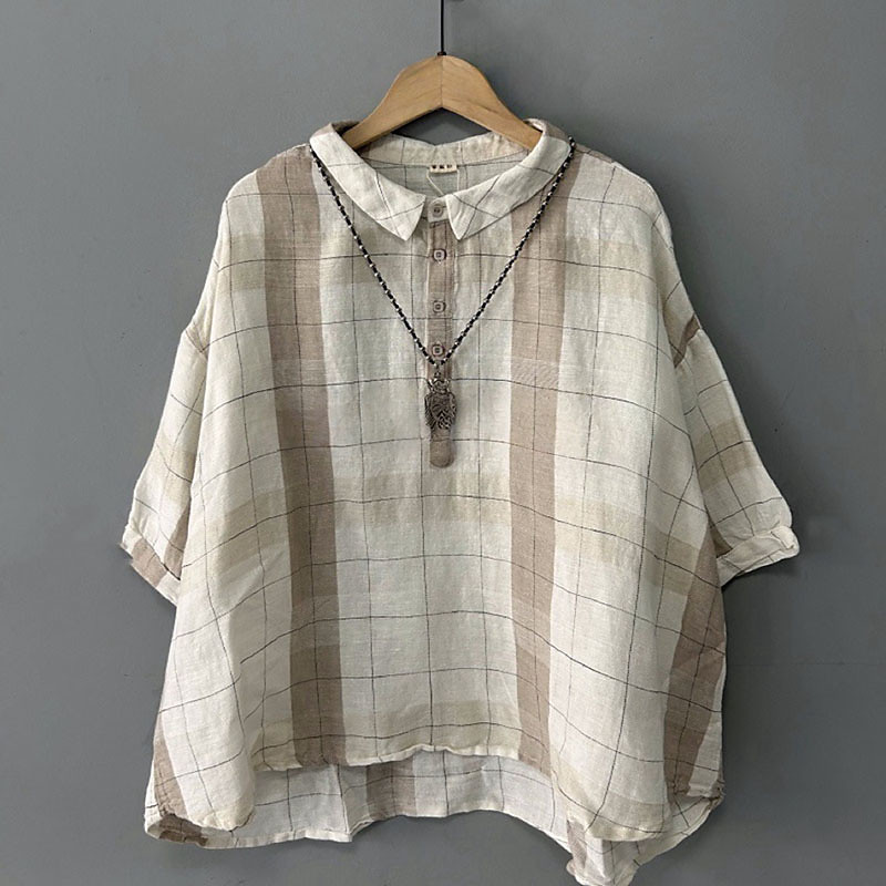 Women's Cotton Linen Shirts Blouse Plaid Elegant Vintage Stylish Short Sleeve Crew Neck Regular Tops Daily Holiday Going out Buttons Black Beige Summer Spring