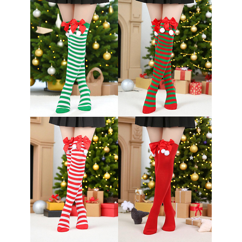 Women's Christmas Thigh High Socks Set, 4-Pair Striped Solid Red Holiday Stockings with Bows and Pom Poms, Festive Over-the-Knee Socks for Winter Parties Gifts