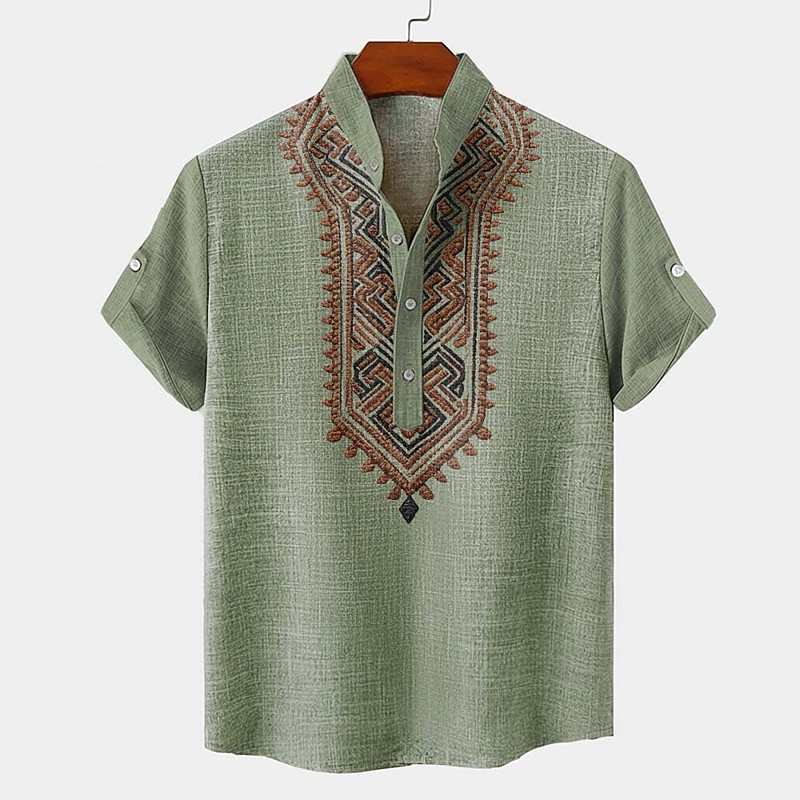 Men's Ethnic Linen Shirt Summer Shirt Short Sleeve Casual Tribal Vacation Daily Summer Spring Mandarin Collar Print Green Khaki Gray