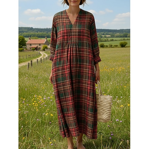 Per donna Abito Midi Vestito Casual Abito a Tubino Vintage Quotidiano All'aperto Vacanza Vestibilità comoda Plaid Manica Lunga Scollo a V Vino Estate Primavera Autunno