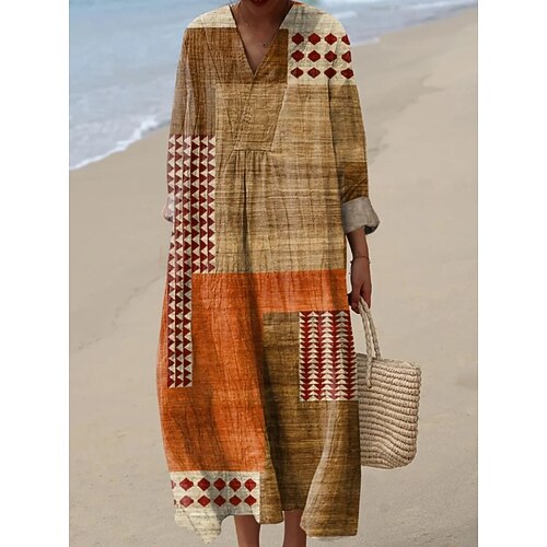 Per donna Abito maxi Vestito Estivo Abito a Tubino Vacanza Casual Spiaggia Uscire Vestibilità comoda Grafico Geometrico Astratto Manica Lunga Scollo a V Blu Marrone Cachi Estate Primavera