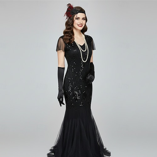 Set Retrò Vintage Anni Ruggenti Anni 1920 Lunghezza al pavimento Vestito Abiti Abito da cocktail con accessori Maniche corte Il grande Gatsby Invitato al matrimonio Paillettes Scollo a V Costume Per
