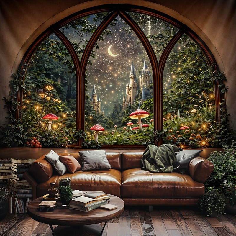 Fantasy Castle Window Tapestry featuring Magic Woodland Scene Large Fairytale Moon Mural for Bedroom Dorm and Living Room Wall Decor
