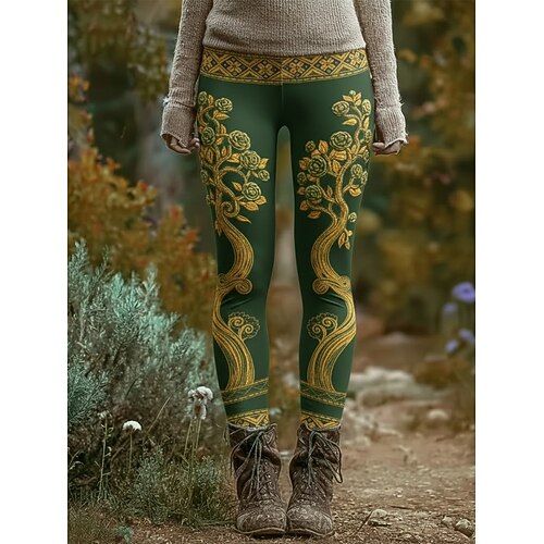Damen-Leggings im Wikinger-Stil, kuschelig, lässig, für Urlaub und Freizeit, lange Länge, hoher Bund, florales Grafikmuster, bequem, hochelastisch, für Alltag und Outdoor-Aktivitäten, dunkelgrün,